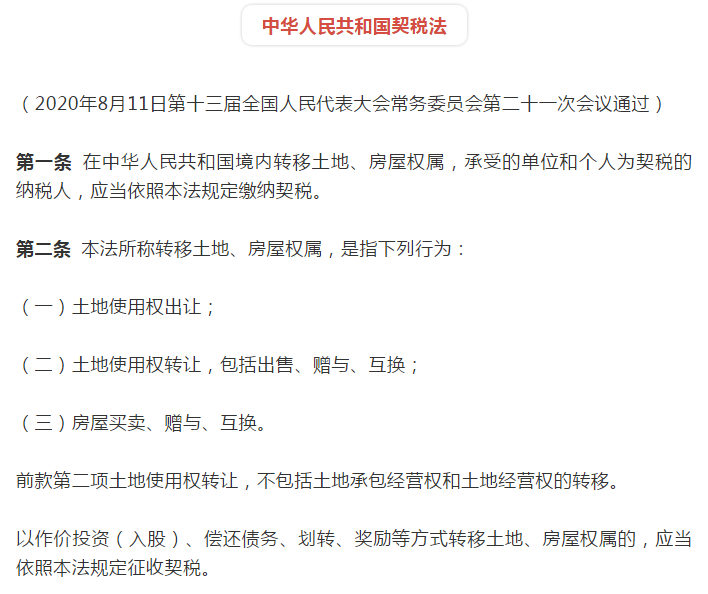 在此之前,咱们国家对于契税的规定,根据的是1997年发布的《中华人民共和国契税暂行条例》。这属于国务院令,而这次是立法成为了《中华人民共和国契税法》,是上升到了立法的角度。